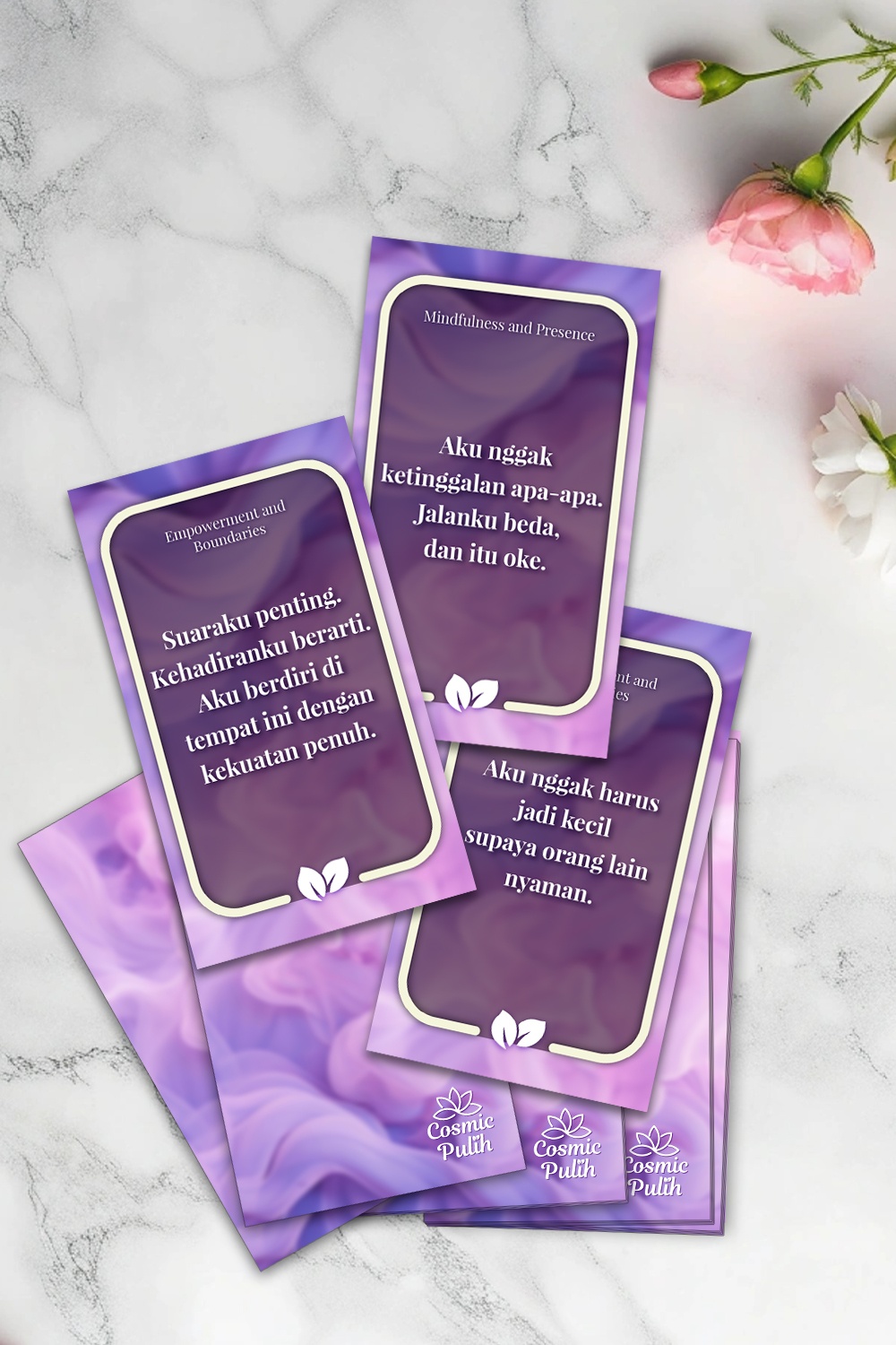 - Desain estetik, calming, dan elegan, dengan ukuran kartu 70 x 120 mm (vertikal/portrait)